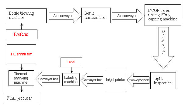 The whole production process is that the empty bottle is conveyed quickly and stably into rinsing filling capping machine by air conveyor, and that after capping, carbonated drinks is conveyed to coders where it is printed on date of manufacture, labeled, and the final shrink membrane packing. During the production process, the water treat equipment (water filtration sterilizers systems) provides purified water to rinse the PET bottles and mix the carbonated drinks, and the method of filling carbonated drinks is isobar filling. The whole process is controlled by PLC and runs automatically. Through the touch screen, users can see visually the running conditions of the production line and can also carry out some relevant operation to adjust its output.